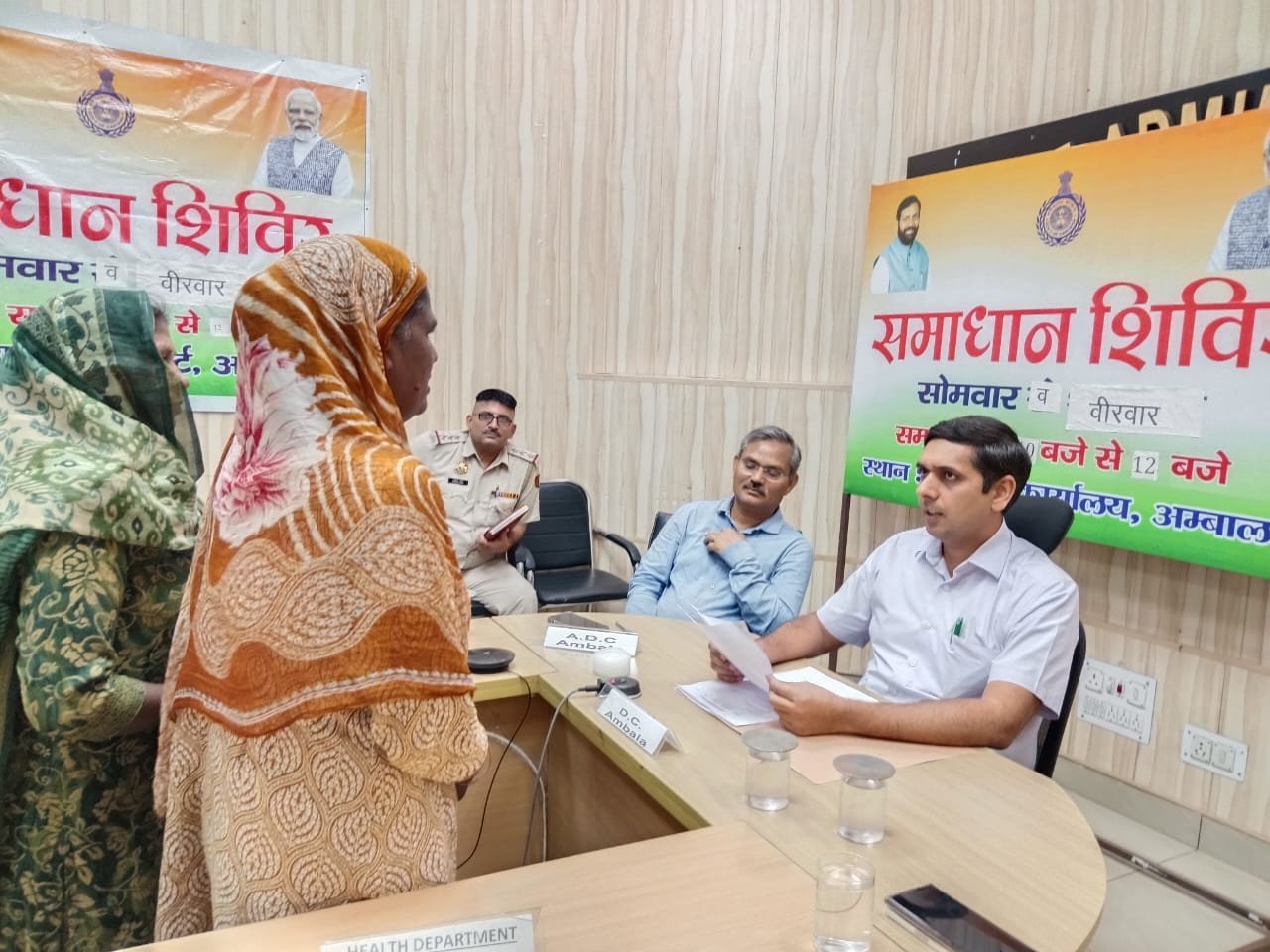 हरियाणा सरकार द्वारा निर्देशित अंबाला मे जिला स्तर व उपमंडल स्तर पर प्रत्येक सोमवार व वीरवार को सुबह 10 बजें से 12 बजें तक समाधान शिविर आयोजित किए जा रहें है। इस मौके पर अतिरिक्त उपायुक्त महेंद्र पाल, नगराधीश अभिषेक गर्ग, डीएसपी विजय कुमार, एसडीओ बिजली विभाग जोगिंद्र के साथ अन्य विभागों के अधिकारीगण मौजूद रहें।